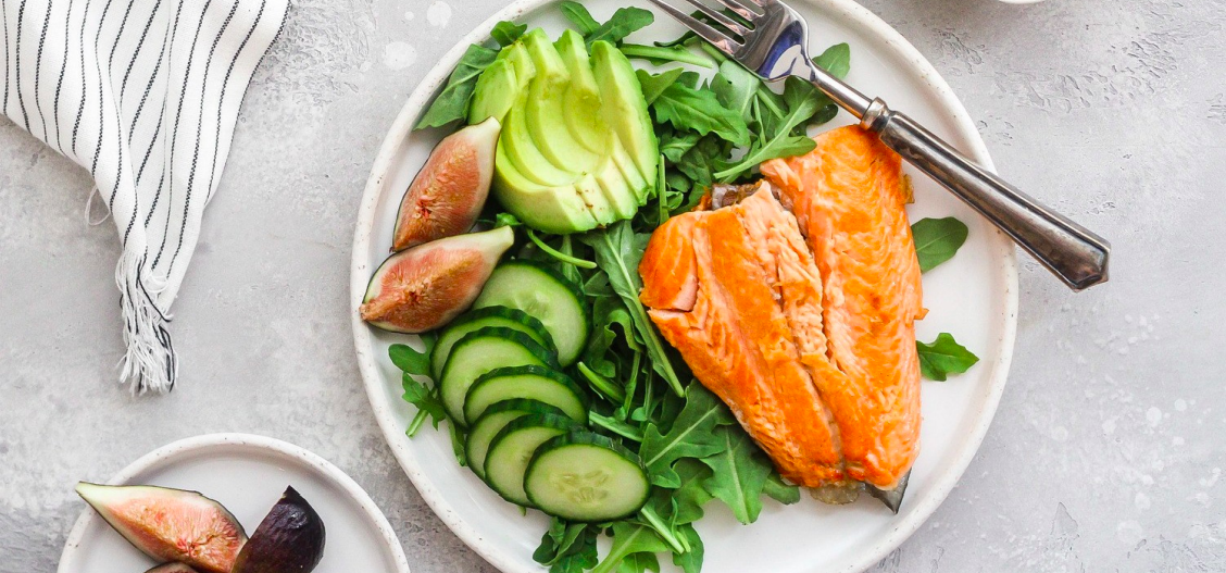 Add the arugula to a plate and top with the cucumber, avocado and fig, if using. Drizzle the dressing over top and place the salmon on top. Enjoy!