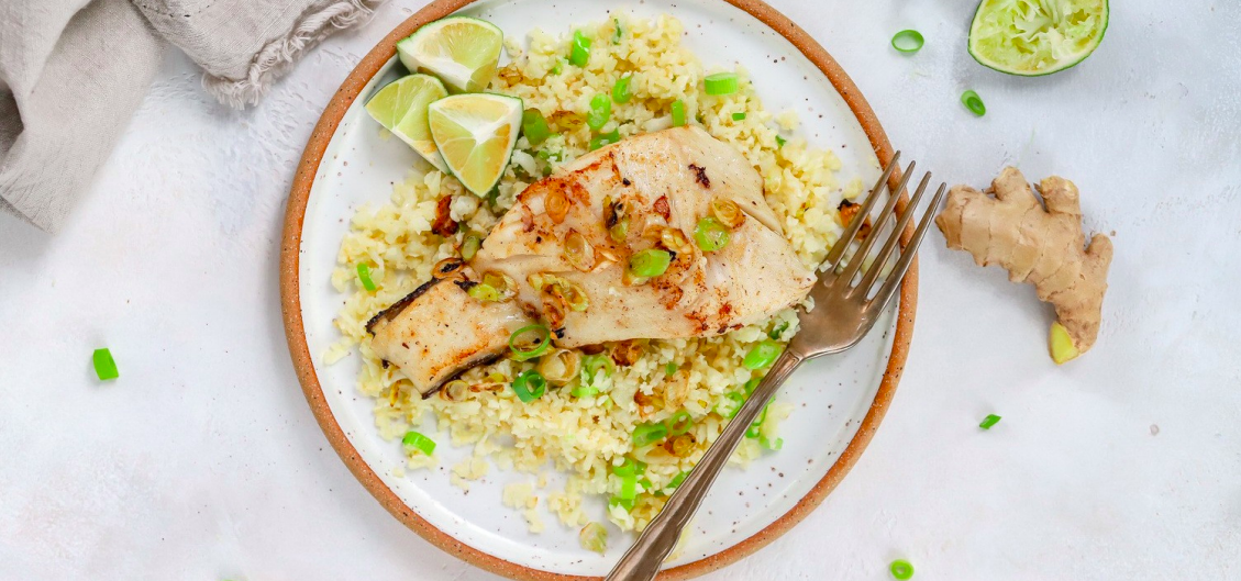In a small bowl, add the cod along with the ginger, coconut aminos and half of the avocado oil. Let it sit while you prepare the cauliflower rice.