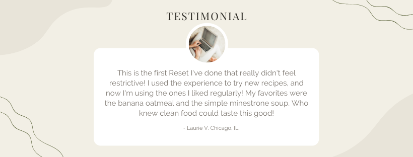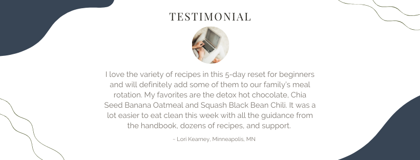 ❤️ “By far, this has been the easiest reset I have ever done! And, I actually lost weight, just under 4lbs in 5 days! That is amazing for me as I usually lose less than a pound in a week. I especially love the Mediterranean Chicken and Banana Oatmeal, which I topped with pomegranate seeds. I also had an office full of sick people and I am happy to say I never caught their colds. I think this boosted my immune system as well! I would recommend the 5-Day detox to anyone who is considering it. It's simple, easy and you can eat real food!
